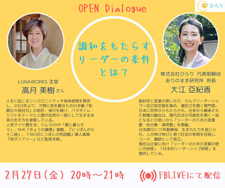 株式会社ひらり・大江亞紀香さんとのオンライン対談 「オープンダイアログ」にゲスト出演します。 「調和をもたらすリーダーシップ」をテーマに、日本の智慧も交えながら対話します。